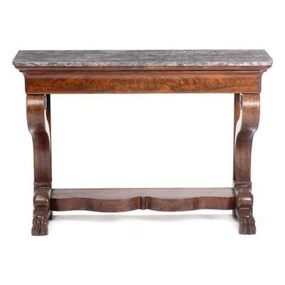 Console Charles X mahogany opening to a drawer in the belt, claws feet. Gray marble tray, France, nineteenth.
