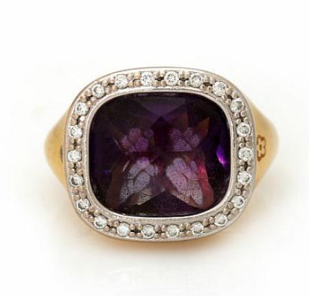 A "Cushion" ring set with a fancy-cut amethyst encircled