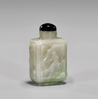 Chinese carved and well-hollowed jadeite snuff bottle; each side of the rectangular form with figural relief panel, that of the face carved entirely of russet 'skin'; 19th Century; H: 2 1/4" (approx.); hardstone stopper