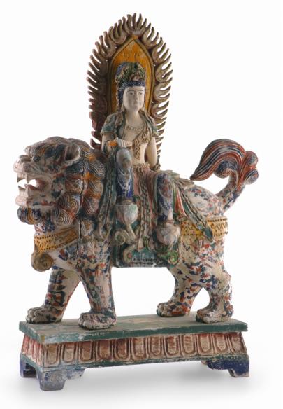 Polychrome enameled Guanyin seated on enflamed throne seen holding a scroll in right hand while atop a large foo lion