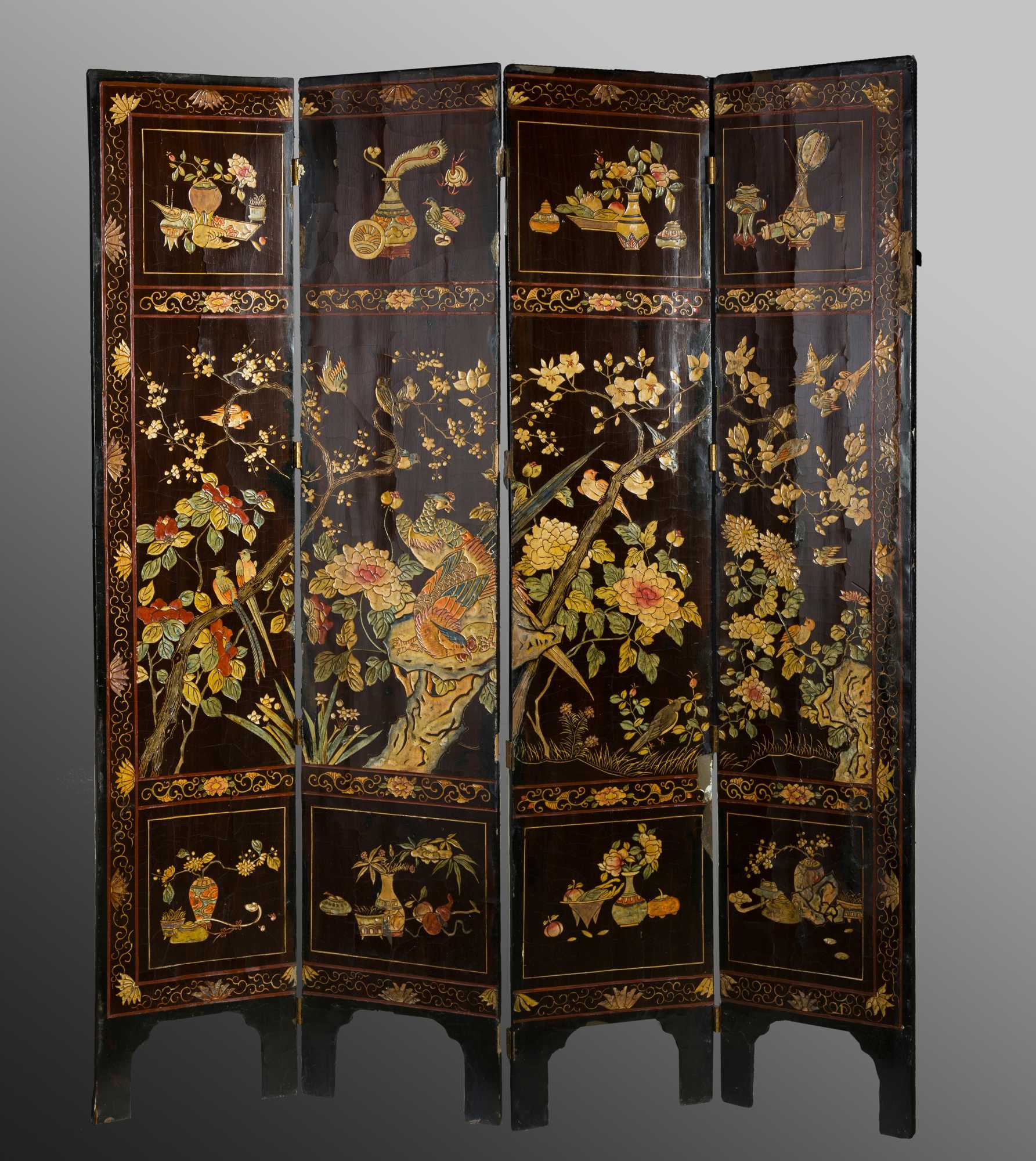 double sided decoration with flowers and birds on one side and homes scenes with people on the other, 78 1/2" tall X 64" wide. 19thC Chinese export, some edge losses.