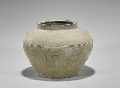 Chinese Han Dynasty pottery jar; of ovoid form, with raised rim; showing incised concentric bands to shoulders; H: 8 3/4" (approx.)