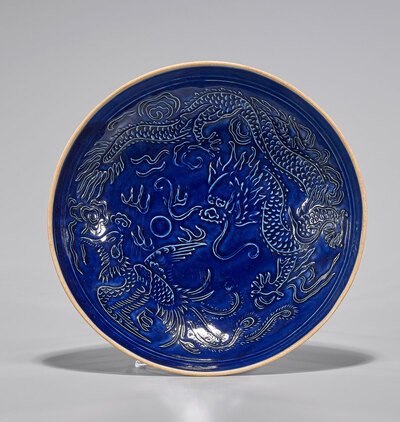Chinese Ming-style cobalt blue glazed porcelain dish; centering moulded dragon and phoenix contesting flaming pearl; D: 8" (approx.)