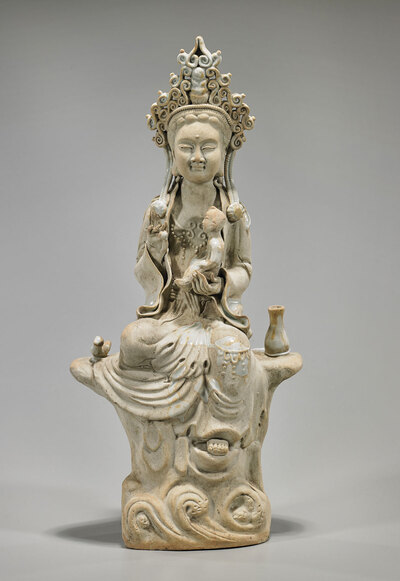 Chinese Yuan-style parcel-glazed pottery figure of Guanyin; holding a child in one hand, and a pearl in the other; seated next to a bird and her bottle of tears; all atop a pedestal above stylized waves; H: 15" (approx.)