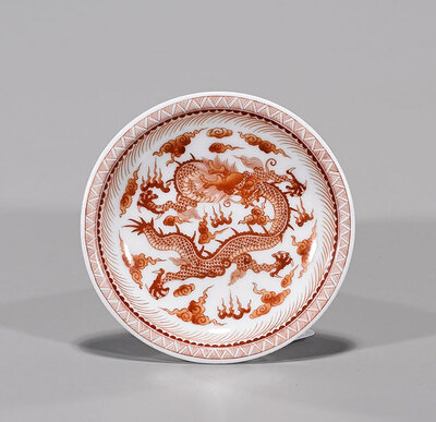Chinese Qianlong-style enameled porcelain dish; centering writhing dragon amid stylized flames and clouds; four-character mark to base, but later; D: 3 5/8" (approx.)