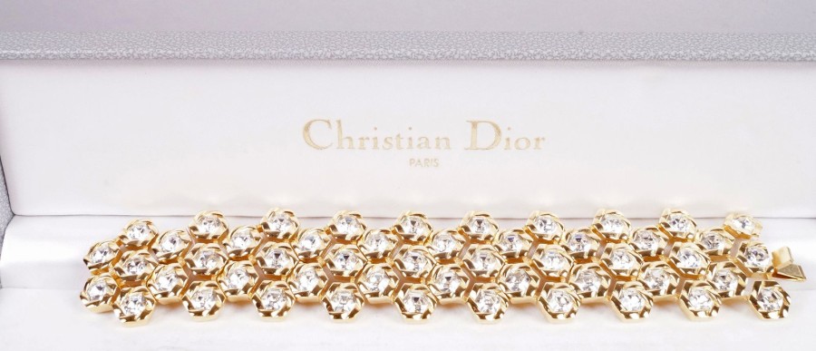BRACELET en plaqué or et strass. L.: 18,5 cm Écrin d'origine.