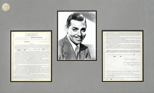 two page contract between M C A Artists, Ltd. and Clark Gable, setting out the terms of his three year engagement with the agency, signed by Gable and the M C A Artists Ltd. Agency representative in black ink, mounted and framed together with a black