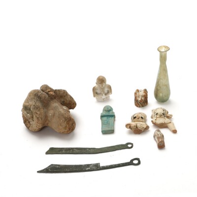 two razors and terracotta figure fragments a.m. L. 5–15 cm.
