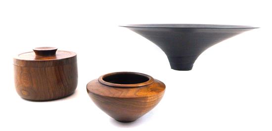 Edmund S. Morgan (American, 1916-2013), two turned walnut pieces: bowl, one flake at neck, 3 3/4" h., and covered round box, flattened disc knob at lid, scratches underside base, 5 5/8" h., both initialed "E.S.M" and inscribed "Walnut" underside base