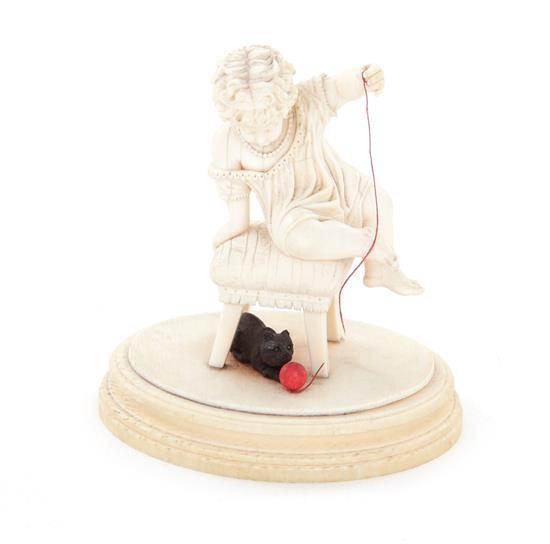 Continental carved ivory figure of young girl playing with kitten early 19th century, seated girl atop stool taunting kitten with yarn. H4 3/4" W4" D3 1/4"
