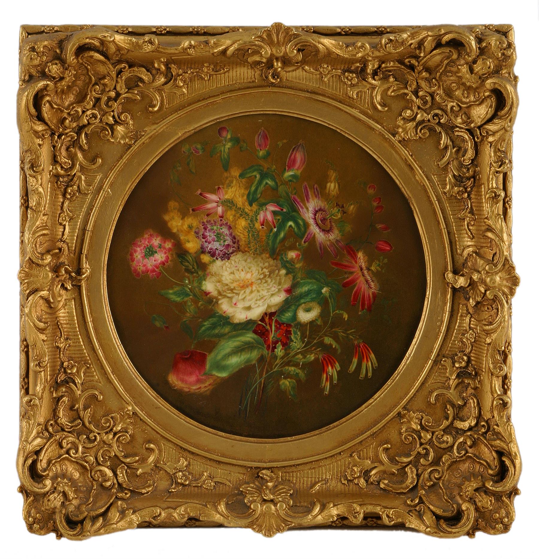 Still life of flowers including a large white peony on a brown ground. 9"d., in a carved and gilded frame,