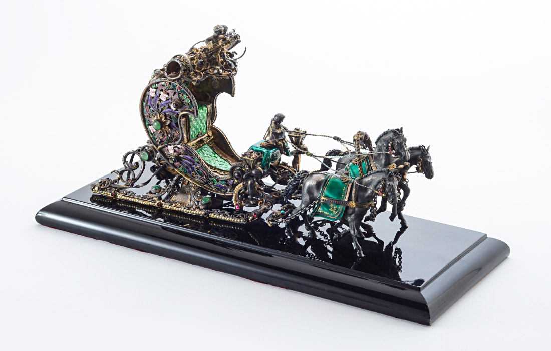 most likely Eastern European manufacturer for the Russian market. Unmarked as to maker, reticulated and engraved with applied enamel, bejeweled in cabochon and seed pearls, traces of vermeil remain. Fine attention to detail on the coach, putti and ho