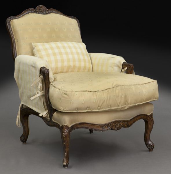 having floral carved crest and seat rail joined by scrolled arms and raised on cabriole legs