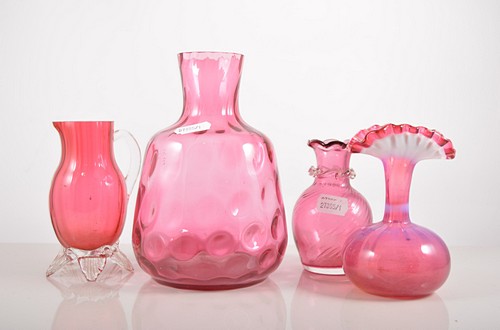 Cranberry glass vase, height 19cm, four cranberry glass bowls, cranberry jug and two tinted glass vases, (8).