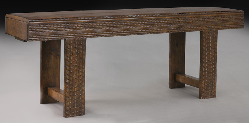the top with faux distressing and both sides carved, with a drawer at each end, on carved plank legs. 32"H x 84"W x 21"D, Circa - Contemporary.
