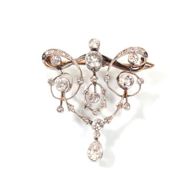 Platin und Gold, Altschliffbrillanten, -diamanten und ein Diamant im Tropfenschliff, zus. ca. 1,30 ct, abschraubbare Broschierung, wiener Kontrollamtszeichen 1867-1922,5,9 g, verbogene Stellen, Steine tlw. mit Oberflächenmerkmalen
