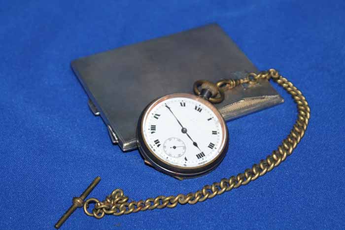 EARLY 20TH CENTURY SILVER CIGARETTE CASE together with a gentlemens pocket watch with brass Albert chain (2)