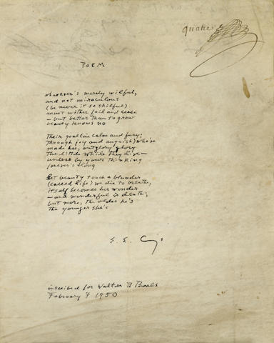 Autograph Manuscript Signed ("E.E. Cummings"), headed "Poem", 1 p, 4to, n.p., February 7, 1950, inscribed for Walter Beals, written on old vellum (a partial 17th century document in French). Matted and framed.