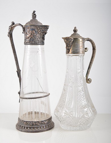Edwardian glass claret jug, silver plated mounts, height 33cm, glass damaged, another silver plated mounted claret jug, decanters, cut and moulded glass, (quantity), (2 boxes).
