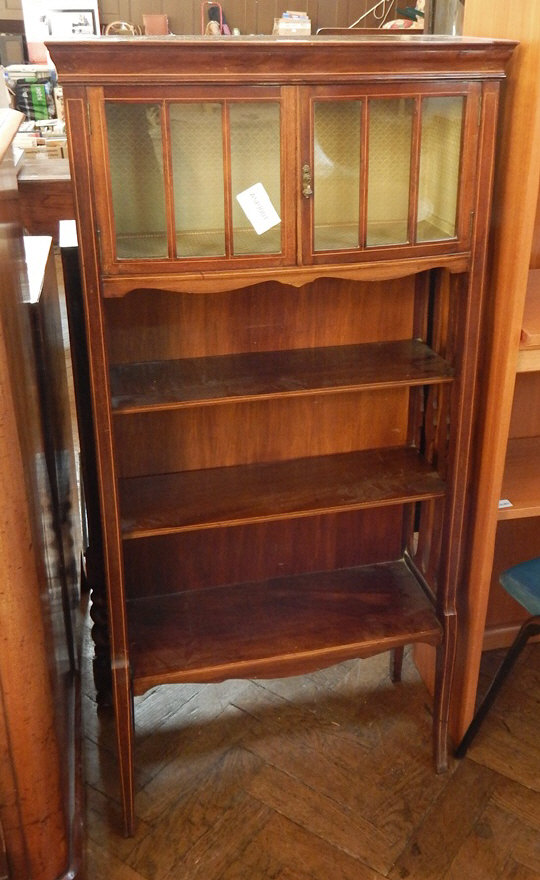 with satinwood stringing, the top with enclosed glazed bookcase and three open shelves below, on splayed legs