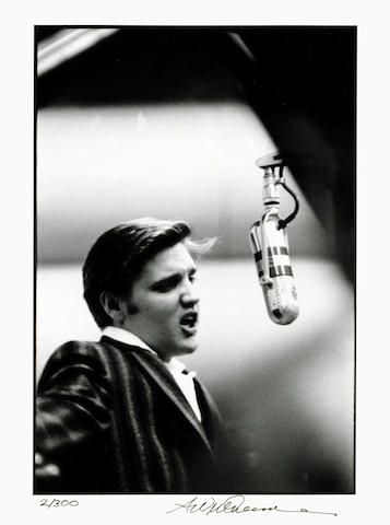 Presley photographed performing on stage and in the recording studio, including recording with the Jordanaires at the RCA Victor studios in New York City, each signed by the artist in black ink and numbered out of editions of 950 and 300, all mounted