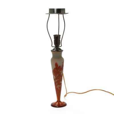 Table lamp/vase of pale green frosted glass overlaid with orange brown glass