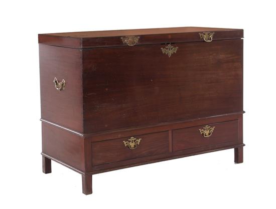 English mahogany storage chest on stand circa 1790, dovetailed case, hinged top over well, on stand with two drawers and square feet; H38 3/8" W51 3/4" D25 1/2"