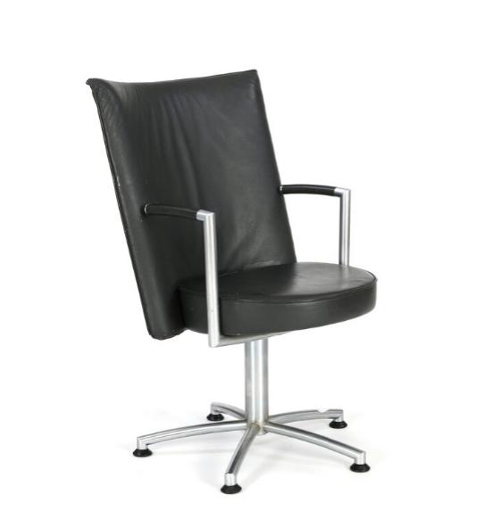 "Partner". Swivel chair with frame of chromed steel. Upholstered with dark grey leather. Model EJ 70-R
