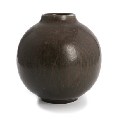 modelled with vertical fluted pattern, decorated with brown glaze with blue elements
