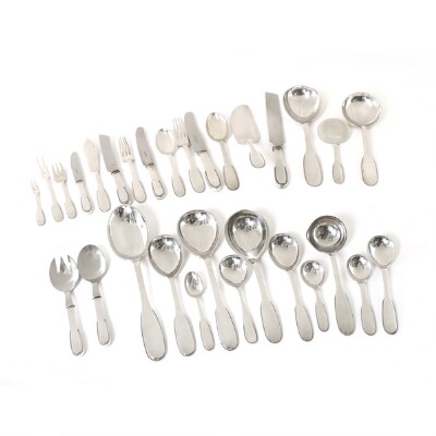 “No. 14”. Silver cutlery set with engravings. Made and marked by Evald Nielsen. Weight excluding pieces with steel 5293 gr. (147) Comprising: 8 fish knives, 16 dinner knives, 12 dinner forks, 8 dinner spoons, 15 luncheon knives, 14 luncheon forks, 1