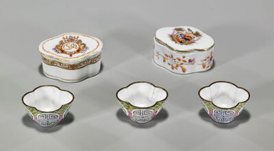 Five Chinese antique pieces, each of quatrefoil form, including: two export enameled porcelain covered boxes, each showing crest and foliate motifs to cover; together with three enamel on copper cups, featuring Shou symbols on a green and pink diaper