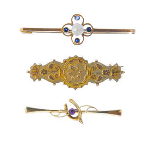 Five late 19th to early 20th century gold brooches.