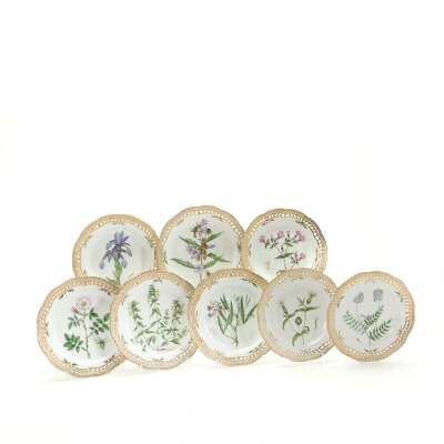 “Flora Danica” eight porcelain plates with pierced border decorated in colours and gold