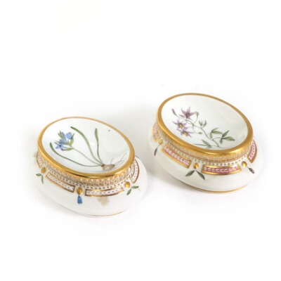 “Flora Danica” two porcelain salt cellars decorated in colours and gold with flowers