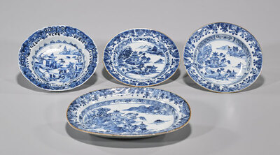 Four antique Chinese export porcelain dishes; of varying forms and sizes; each centering various architectural landscapes, bordered by dense foliate-motifs; 18th/19th Century; L: 8 1/2" (longest, approx.)