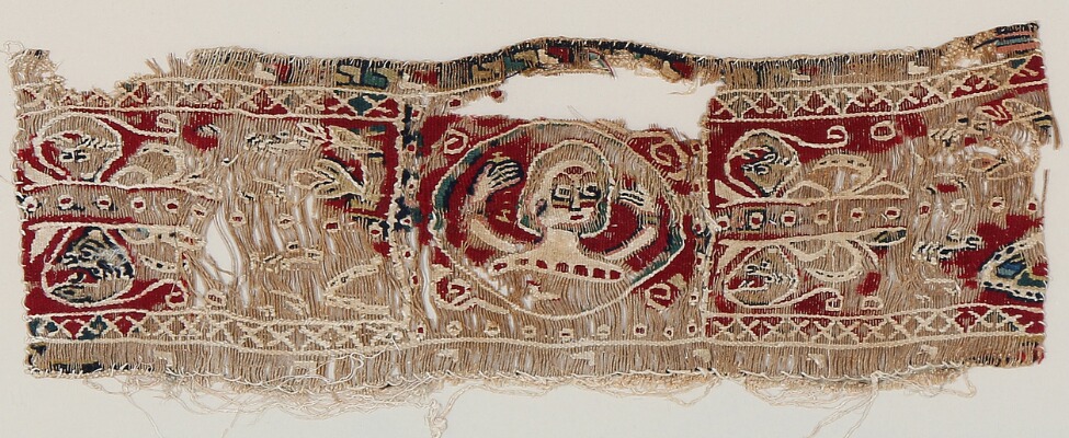 Fragment of Coptic textile in wool and flax, woven with respectively figures in medaillon and figures and animals