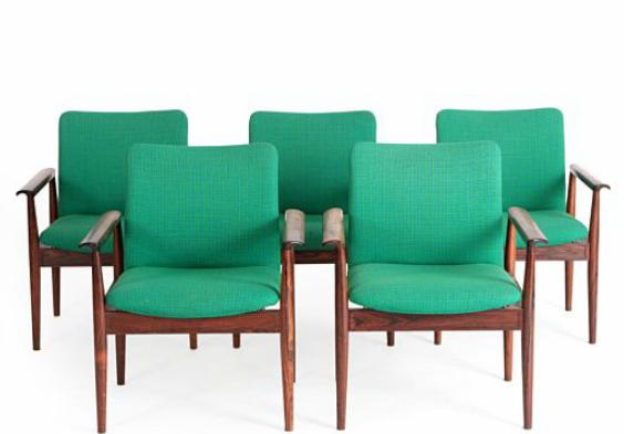 Set of five armchairs with frame of East Indian rosewood. Upholstered with green wool