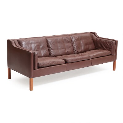 A free-standing three-seater sofa with mahogany legs, upholstered on sides, back and loose cushions with brown patinated leather. Model 2213. Designed1962. Manufactured and marked by Fredericia Furniture. L. 221 cm.