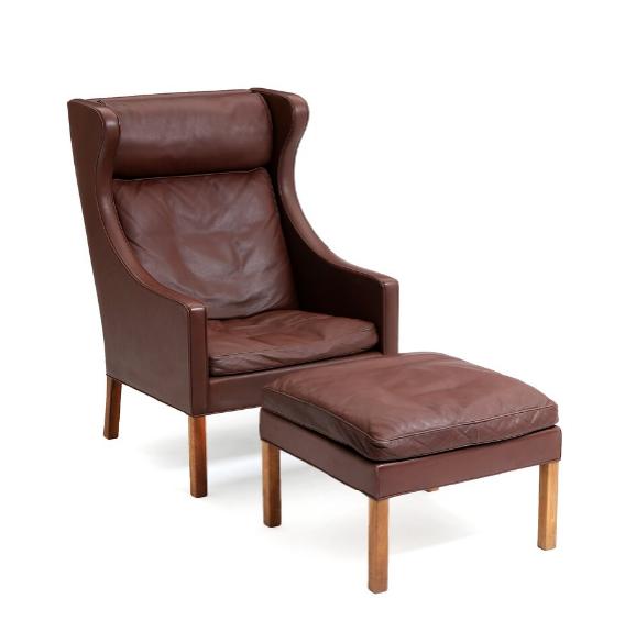 Wingback chair and matching stool with walnut legs, upholstered with brown leather