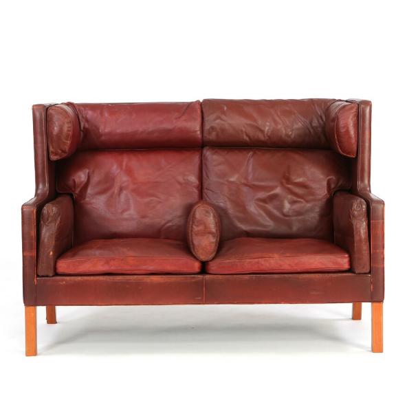 "Coupé sofa". Freestanding two-seater with legs of mahogany. Seat, sides and back upholstered with wine red leather. Model 2192. Designed 1971. Manufactured and marked by Fredericia Stolefabrik. H. 106 cm. L. 155 cm. D. 88 cm.