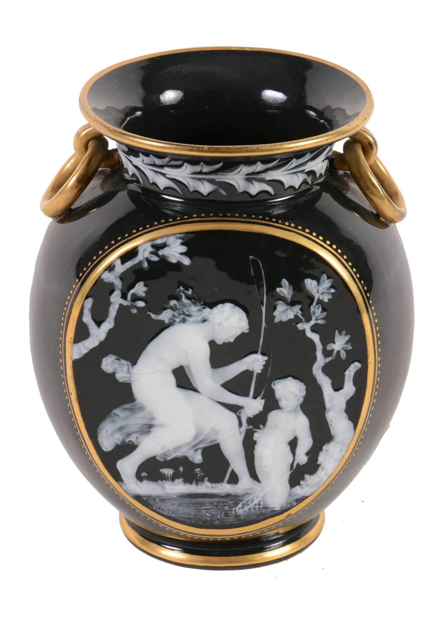 decorated in white low relief with a woman and child fishing, beneath a stiff holly-leaf border