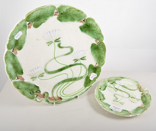 French Majolica Art Nouveau style part service, decorated with water lilies, comprising platter, diameter 31cm and five plates, (6).