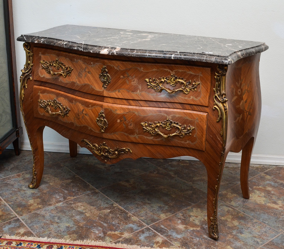 Bombe style front, variegated grey marble top, floral motif marquetry inlaid sides and 2 front drawers. Gilt metal ormolu and pulls, shaped legs