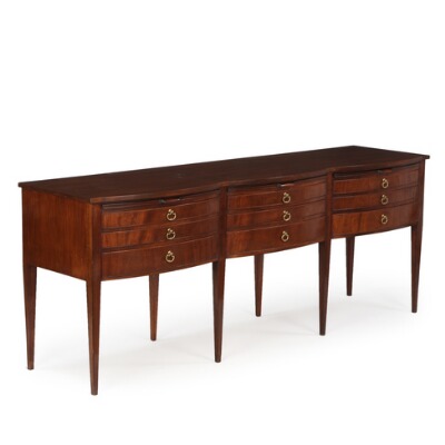 Sideboard of mahogany, curved front with nine drawers with brass handles and three pullout leaves, eight tapering legs. Made and designed by cabinetmaker Frits Henningsen. Back marked with model no. 7736. H. 82 cm. L. 210 cm. D. 57 cm.