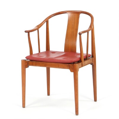 Armchair of nutwood. Seat cushion upholstered with red leather.