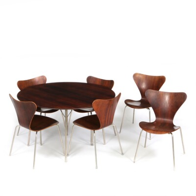 Dining room, consisting of circular table and six chairs of Brazilian rosewood and legs of steel. Model 3600 and 3107. Designed 1952 and 1955