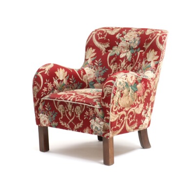 Easy chair with stained ash legs, upholstered with patterned fabric.