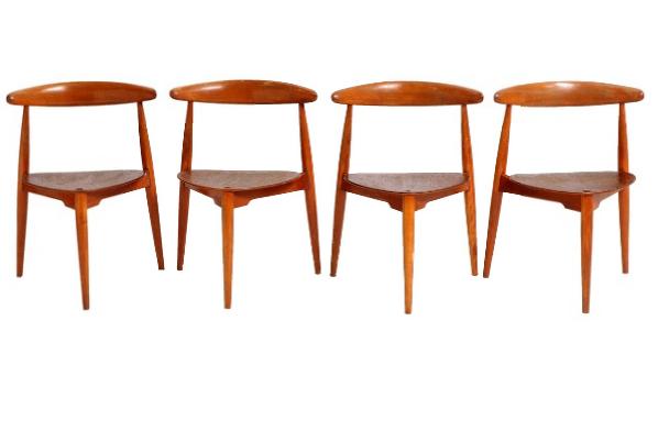 "Heart Chair". A set of four three-legged beech chair with moulded teak seat. Model FH 4103. Designed 1953. Manufactured by Fritz Hansen. (4) Presented at the Furniture Manufacturer Association exhibition in Fredericia the 28th-31th May 1953. Literat