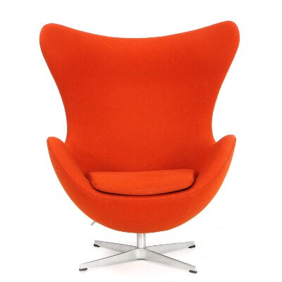 “The Egg Chair”. Easy chair with tilt function, aluminum star base, upholstered with orange wool. Manufactured by Fritz Hansen, 2002.