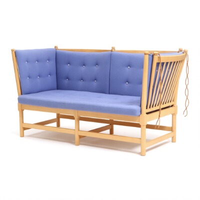 Two-seater sofa with beech frame, loose cushions with violet wool.